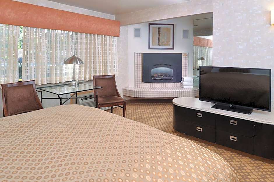 Featuring a large vanity in the private bathroom, this room features a flat-screen cable TV, a seating area and an activity table with two chairs.